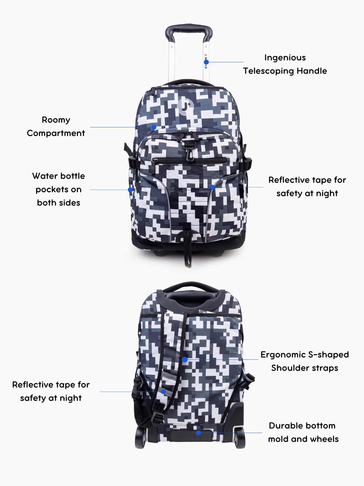 The perfect travel companion, this durable wheeled backpack combines functionality and safety. Lunar Laptop Rolling Backpack features a padded sleeve that fits up to a 15.4-inch laptop and a front pocket organizer with a pencil holder, key fob, and zipper pocket for easy access to your essentials. Designed to fit under airplane seats or in overhead compartments, it includes adjustable compression straps, soft, noiseless wheels, and reflective accents for night safety. Whether for school, work, or travel, this backpack offers a hassle-free, organized experience.